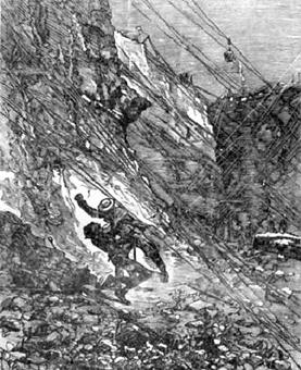 Неприветливая местность, голые скалы и множество зияющих глубоких ям делали прииск скорей похожим на каменоломни. Мельчайшая пыль, подымавшаяся над разрытой землей, образовала густые тучи; временами она заслоняла солнце. Свежему человеку сразу бросалось в глаза бесконечное переплетение металлических тросов, соединявших дно каждой ямы с поверхностью земли. По тросам, на блоках, беспрерывно подымались наверх вместительные мешки из бычьей кожи, наполненные песком. Небольшое приспособление, похожее на те, какими пользуются в парижских пригородах огородники, подает ведро наверх, едва оно наполняется, и мчит его обратно, как только оно опорожнено.